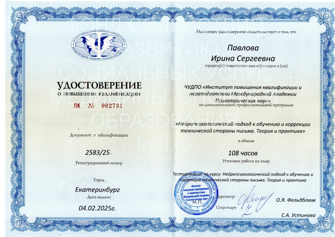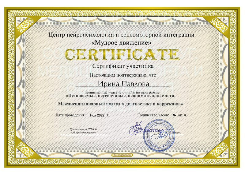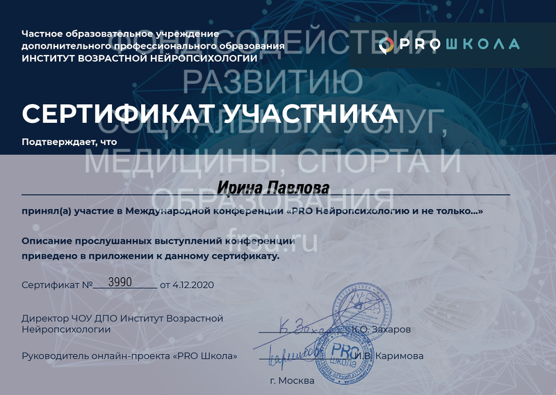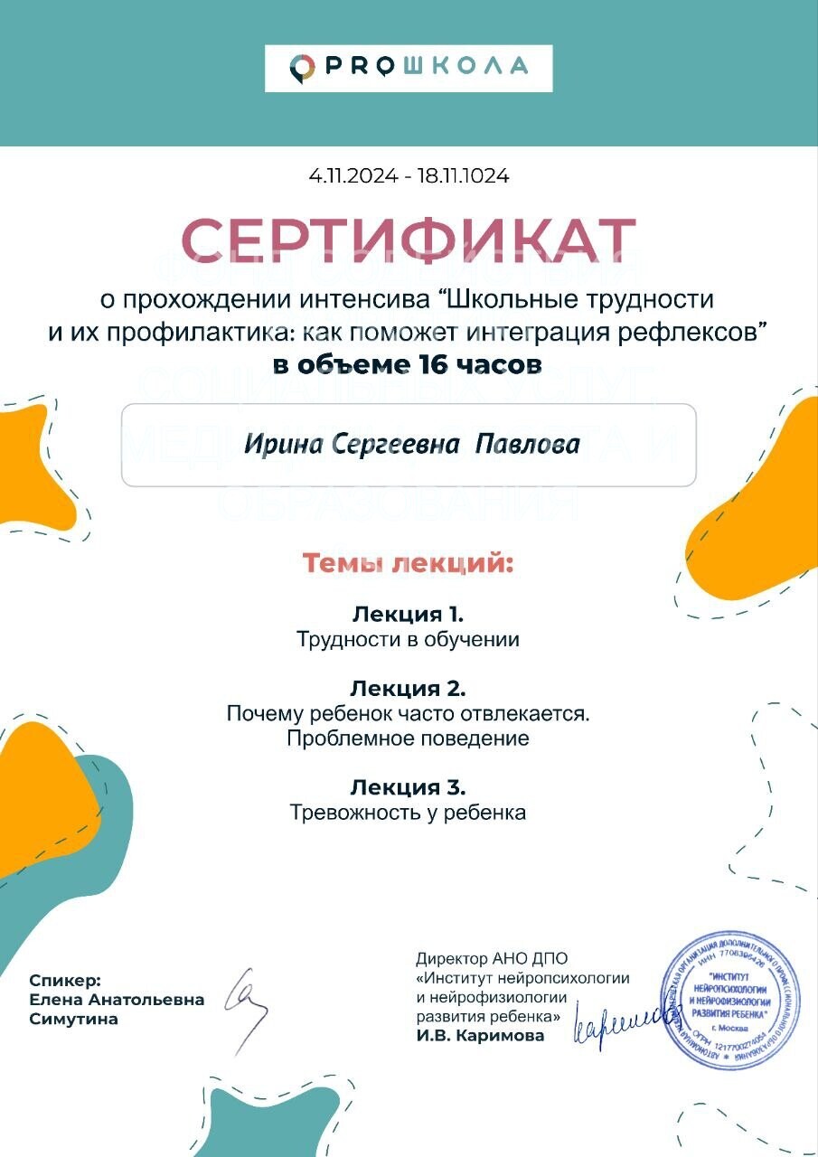 2022 г. - ЧОУ ДПО «Институт нейропсихологии и нейрофизиологии развития ребенка», курс «Нейропсихологический подход к преодолению трудностей обучения» (М. Захарова)