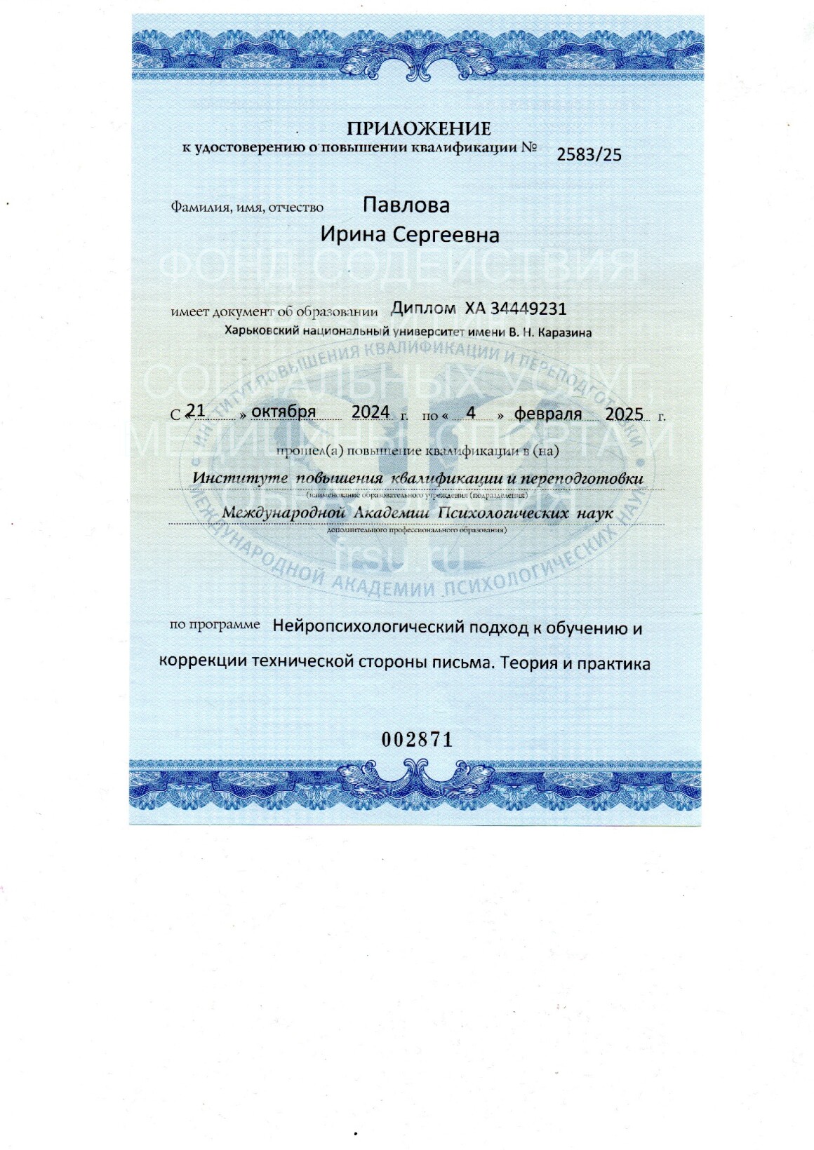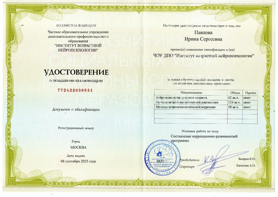 2024 г. - АНО ДПО «Институт нейропсихологии и нейрофизиологии развития ребенка», курс «Методы ранней нейропсихологической диагностики и коррекции детей от 0 до 7 лет. Оценка готовности к школе» (С. Покровская)