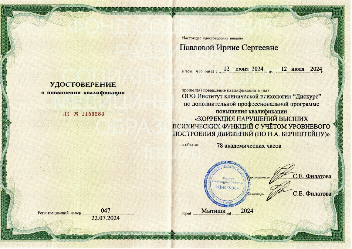 2024 г. - ООО Институт клинической психологии «Дискурс» по дополнительной профессиональной программе повышения квалификации «Коррекция нарушений высших психических функций с учетом уровневого построения движений (по Н.А. Бернштейну)»