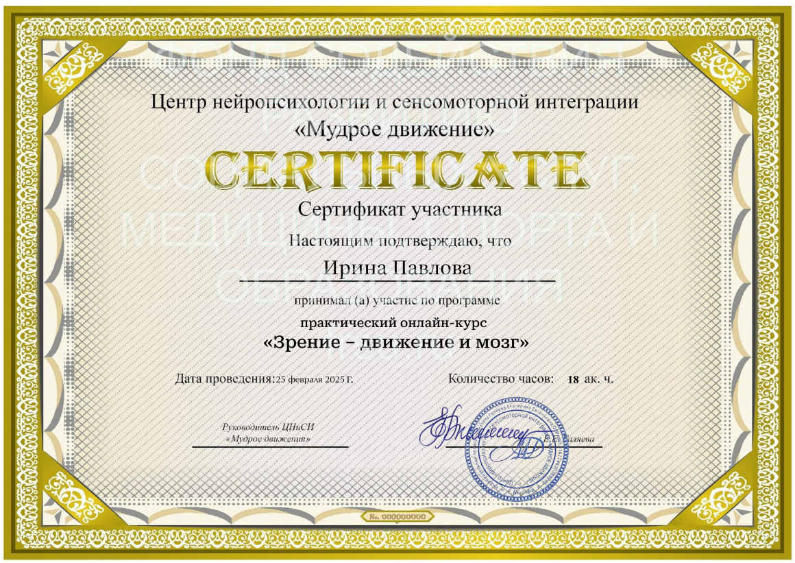 2025 г. - Центр нейропсихологии и сенсомоторной интеграции “Мудрое движение”, принимала участие в он-лайн программе “Зрение-движение и мозг”