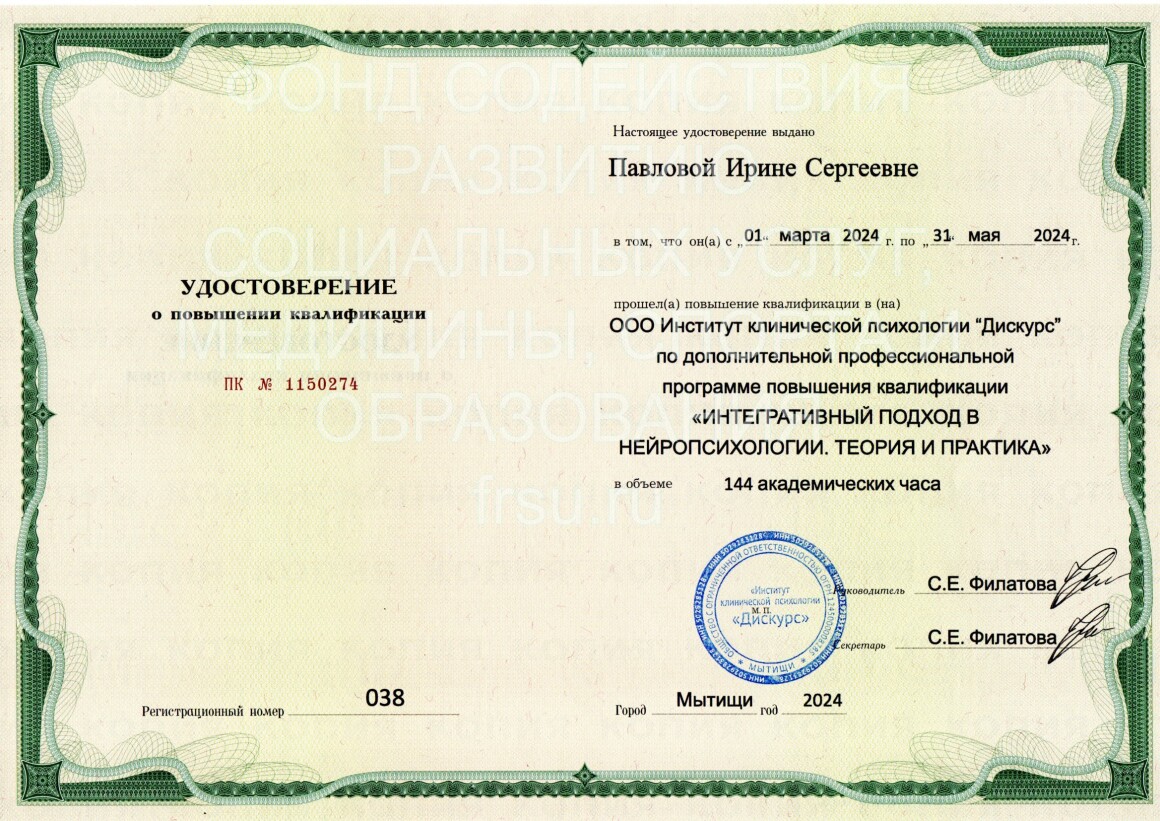 2024 г. - ООО Институт клинической психологии «Дискурс» по дополнительной профессиональной программе повышения квалификации «Интегративный подход в нейропсихологии. Теория и практика.» (С.Филатова)