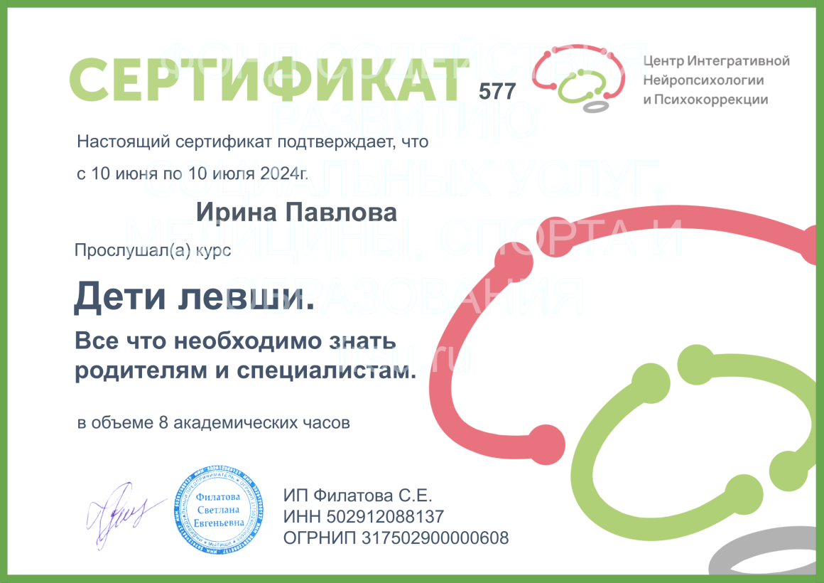 2024 г. - Центр Интегративной нейропсихологии и Психокоррекции, курс «Дети левши, все, что необходимо знать родителям и специалистам.