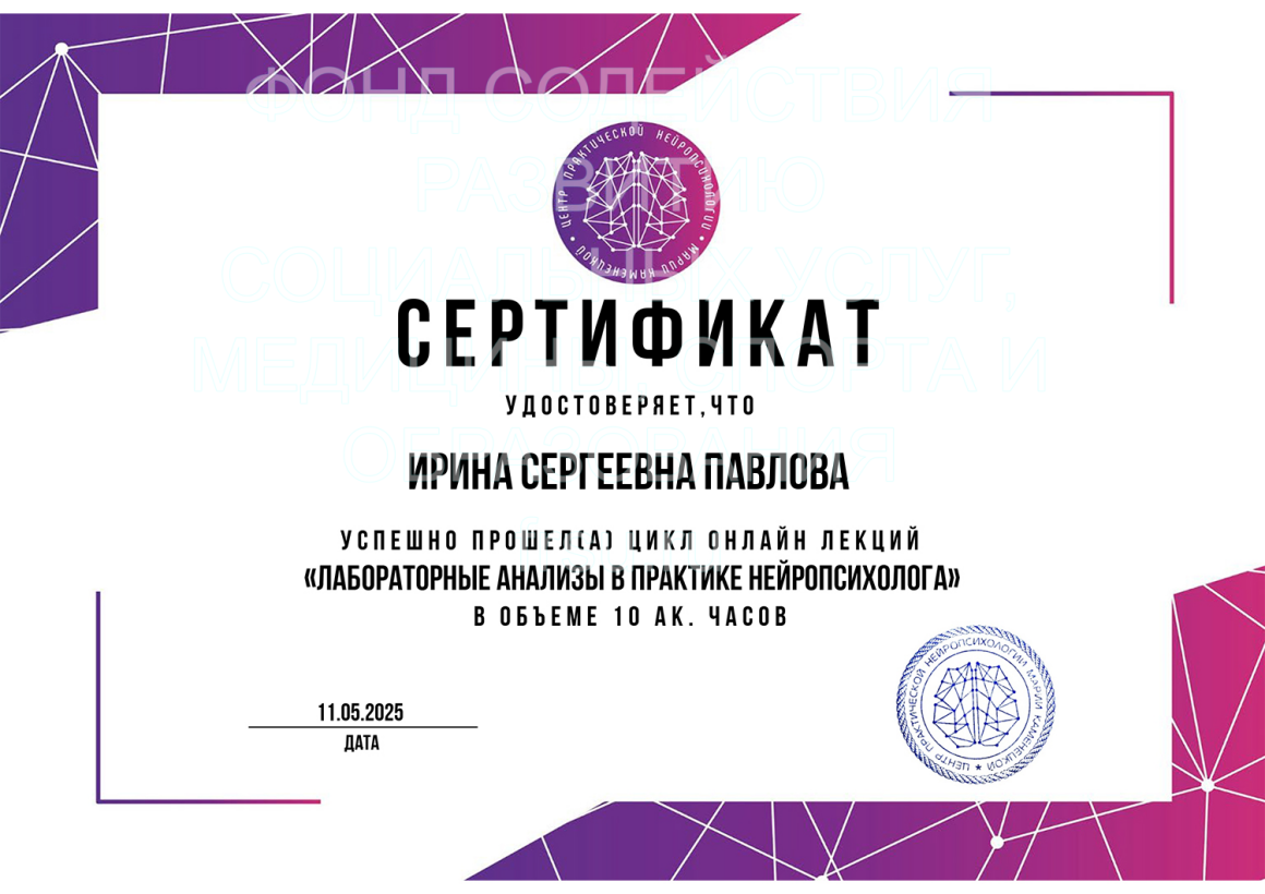 2025 г. - Центр практической нейропсихологии Марии Каменецкой “Лабораторные анализы в практике нейропсихолога”.