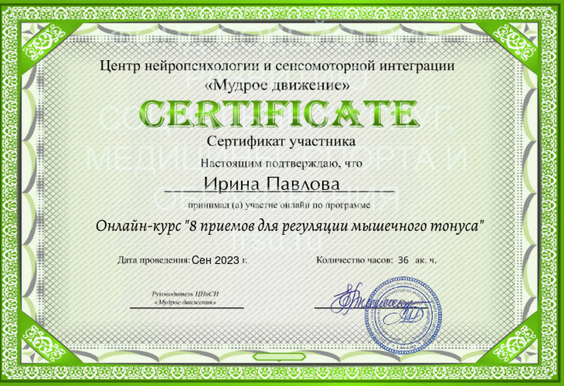 2023 г. - Центр нейропсихологии и сенсомоторной интеграции “Мудрое движение”, принимала участие в он-лайн программе «8 приемов для регуляции мышечного тонуса»