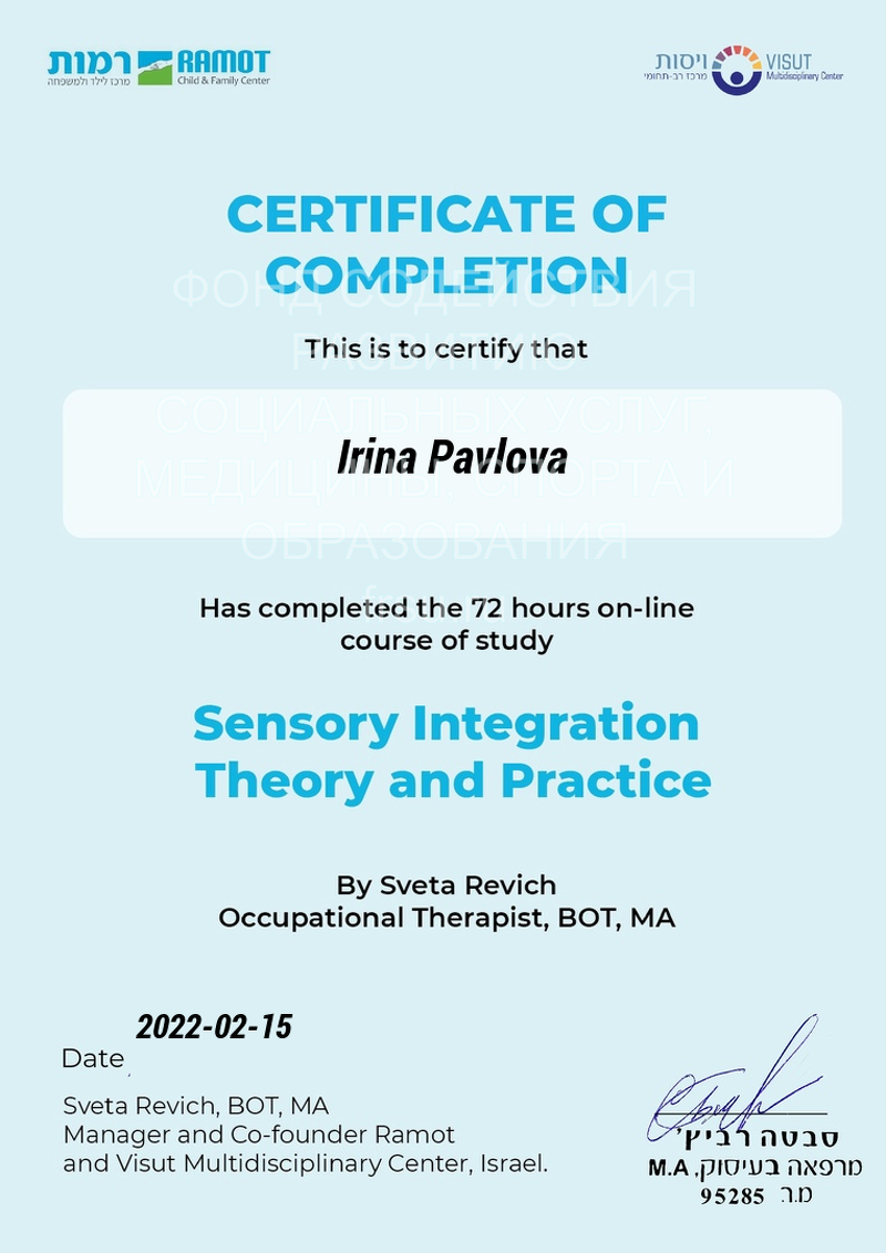 2022 г. - ЧОУ ДПО «Институт возрастной нейропсихологии», Сенсорная интеграция в теории и практике (С. Ревич)