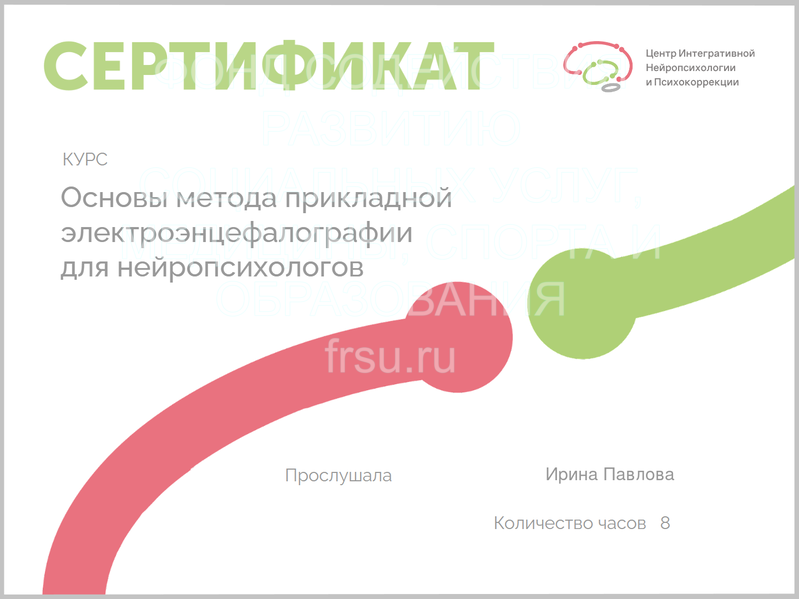 2023 г. - Центр Интегративной нейропсихологии и Психокоррекции, прослушала курс «Основы метода прикладной электроэнцефалографии для нейропсихологов»